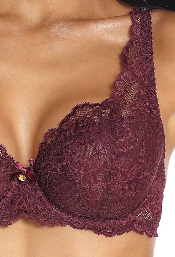 Usztywniany biustonosz o konstrukcji Carmela z eleganckiej koronki. Wewnętrzna strona miski podszyta bawełną. Boczki koronkowe. Posiada ozdobne, regulowane ramiączka, nieodpinane. Haftka dwurzędowa z trójstopniową regulacją. Model idealnie unosi i podtrzymuje biust.