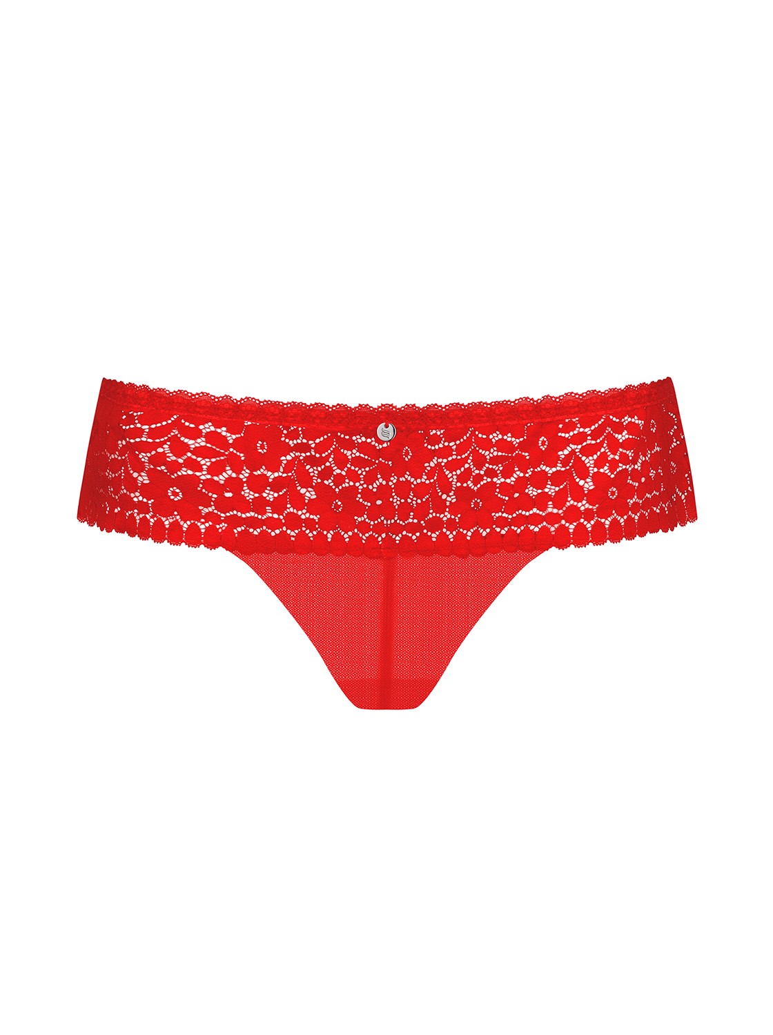 Figi zdobione koronką o wyjątkowo pięknym wzorze. Zjawiskowe połączenie czerwieni i ponadczasowego fasonu. Połyskująca zawieszka na brzuszku. Przyjemny i elastyczny materiał, który dopasowuje się do ciała.