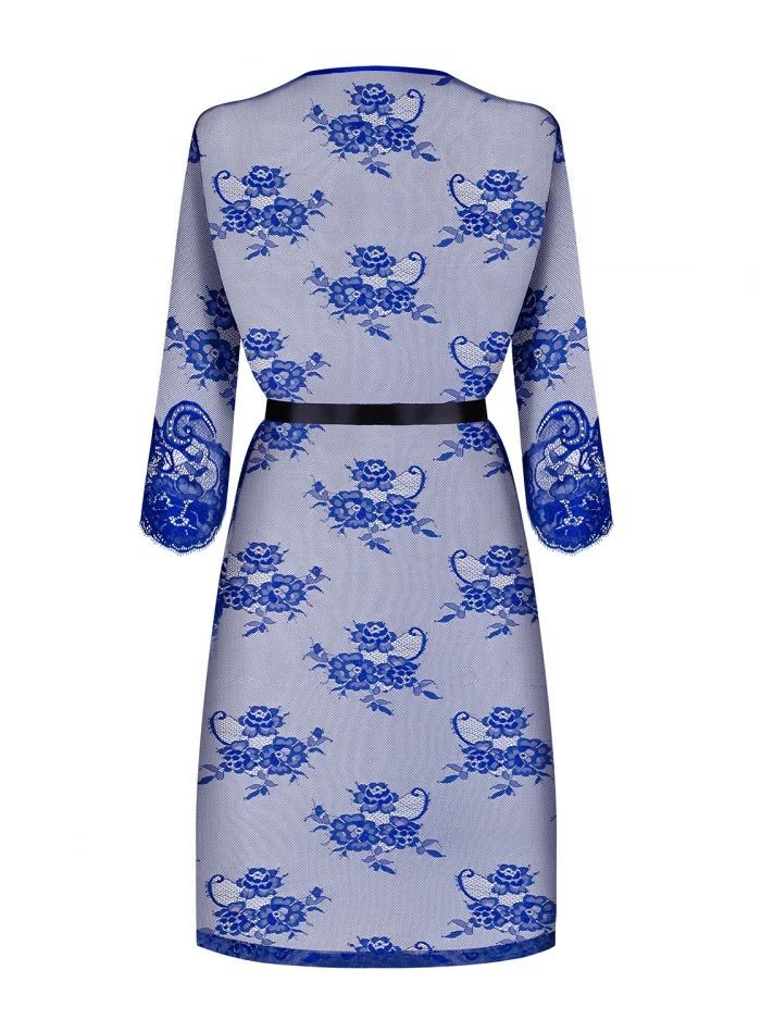 Uroczy peniuar w kolorze kobaltowym. Prześwitujący materiał – sylwetka jest wyeksponowana w bardzo subtelny i wyjątkowo seksowny sposób. Czarne, satynowe wiązanie – maksymalnie kobiece podkreślenie talii. Kwiatowy wzór koronki – zjawiskowy wygląd. Brzegi wykończone koronką typu ‘eyelash’. Dopasowujący się do ciała, elastyczny materiał.