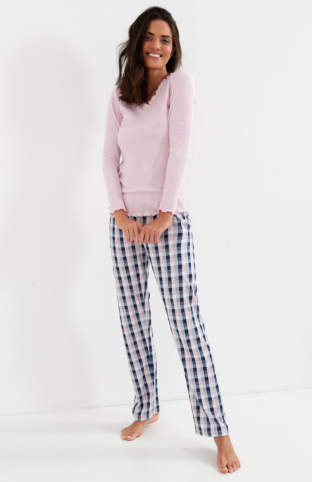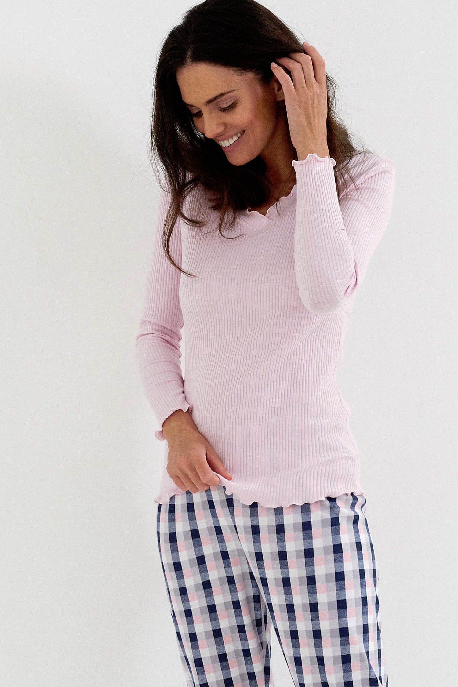 Piżama damska z długim rękawem, wykonana z wysokiej jakości bawełny i micromodalu. Struktura materiału w drobny prążek. Dekolt w delikatny szpic. Spodnie długie w kratkę o luźnym kroju, z uszlachetnionej bawełny typu interlock. Dekolt i mankiety oraz dół koszulki wykończone ozdobną falowaną kroszetką.