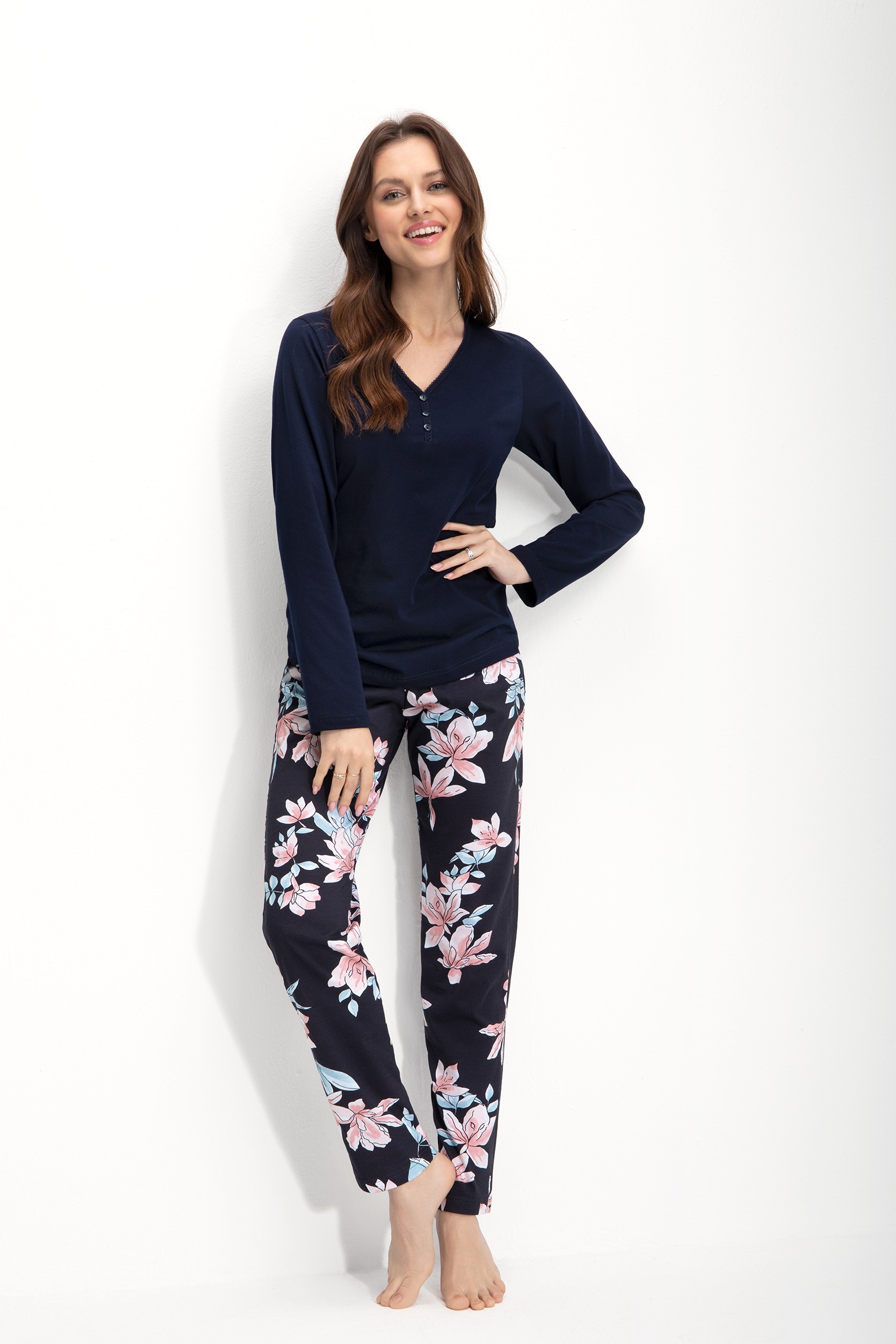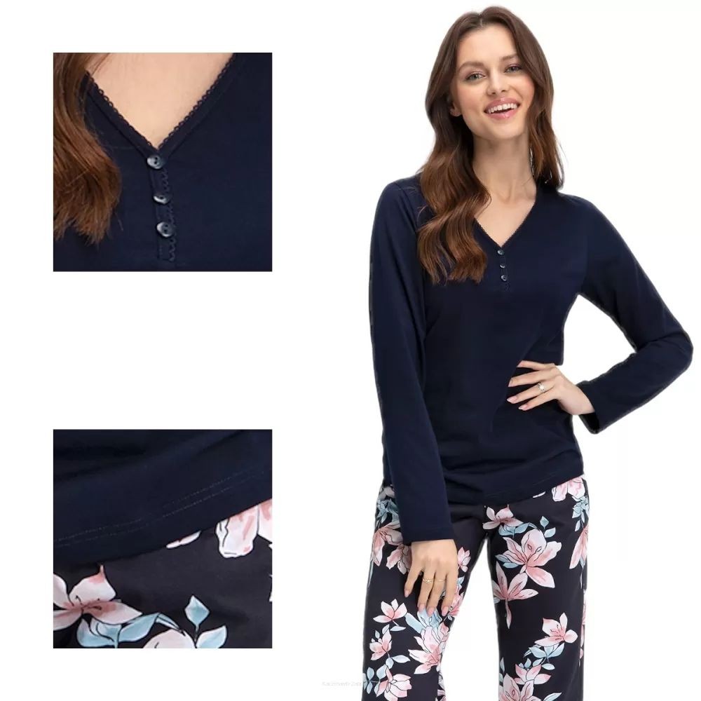 Komfortowa piżama damska to idealna propozycja na chłodne, jesienno-zimowe noce. Piżama wykonana z wysokogatunkowej, miłej w dotyku bawełny. Jednolita koszulka z długimi rękawami, dekoltem ozdobionym mereżką z 3 guzikami. Komplet dopełniają długie spodnie o prostych nogawkach z praktycznymi kieszeniami na bokach. Spodnie ozdobione przepięknym, kwiatowym printem. Gustowne wykończenia sprawiają, że całość prezentuje się bardzo estetycznie i kobieco.
