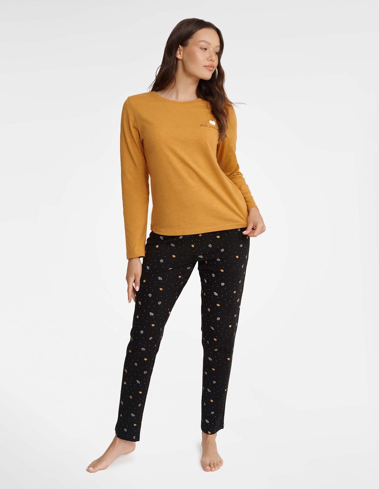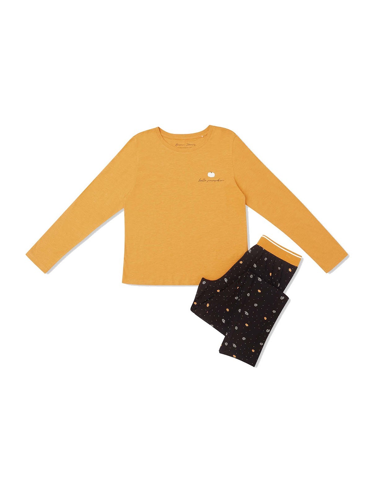 Jesienna aura coraz bliżej nas, przedstawiamy więc najnowszy model GRIND z kolekcji jesień/zima! Musztardowa koszulka z długim rękawem oraz półokrągłym dekoltem zapewni ciepło oraz wygodę podczas snu. Klastka piersiowa z ozdobnym, delikatnym nadrukiem. Komplet dopełniają długie spodnie o prostych nogawkach. Spodnie ozdobione ciekawym wzorem nawiązującym tematycznie do jesieni. Pas z szerokim, kontrastującym ściągaczem.