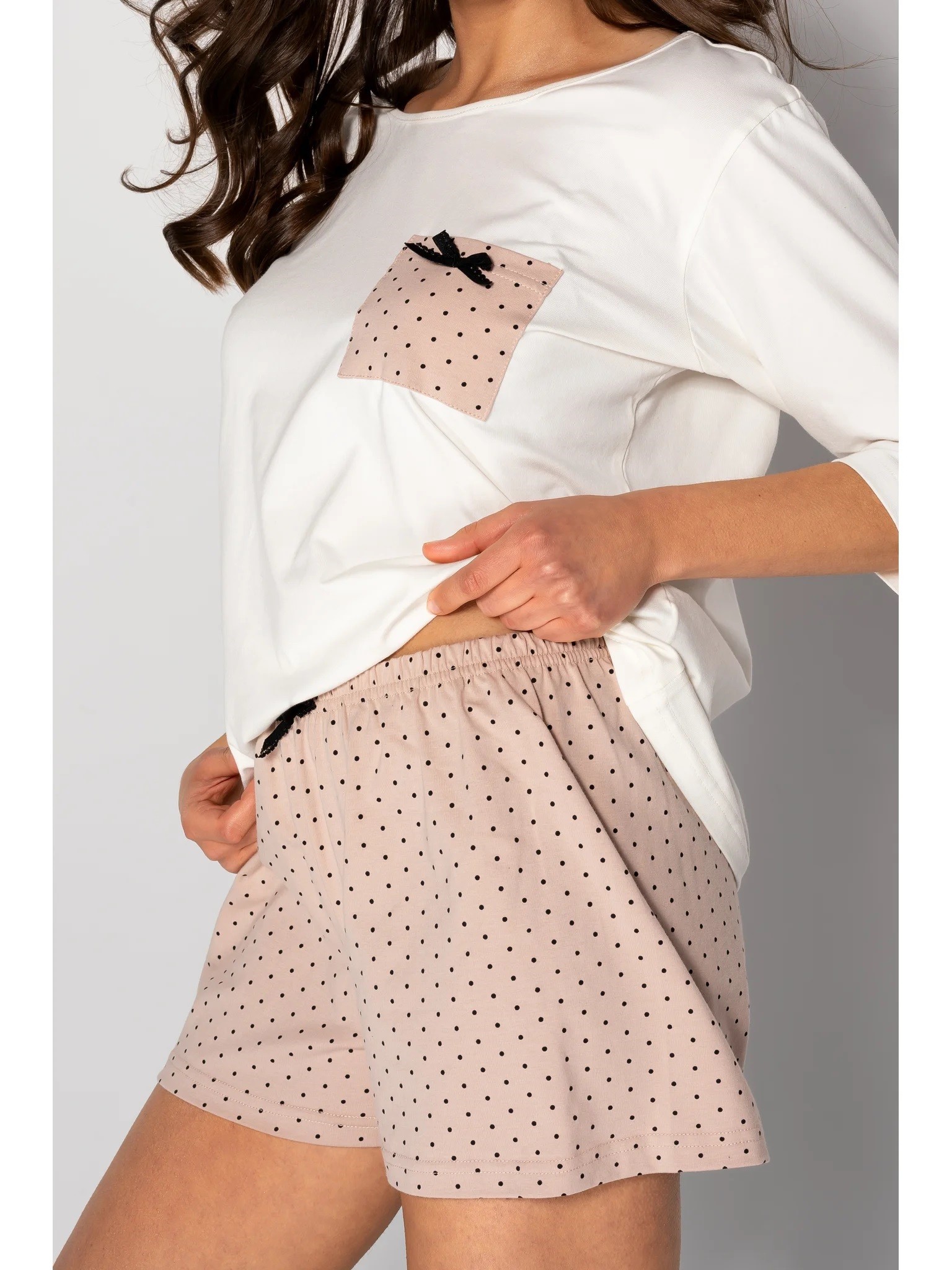 ● krótkie spodenki w groszek, pośrodku z czarną kokardką