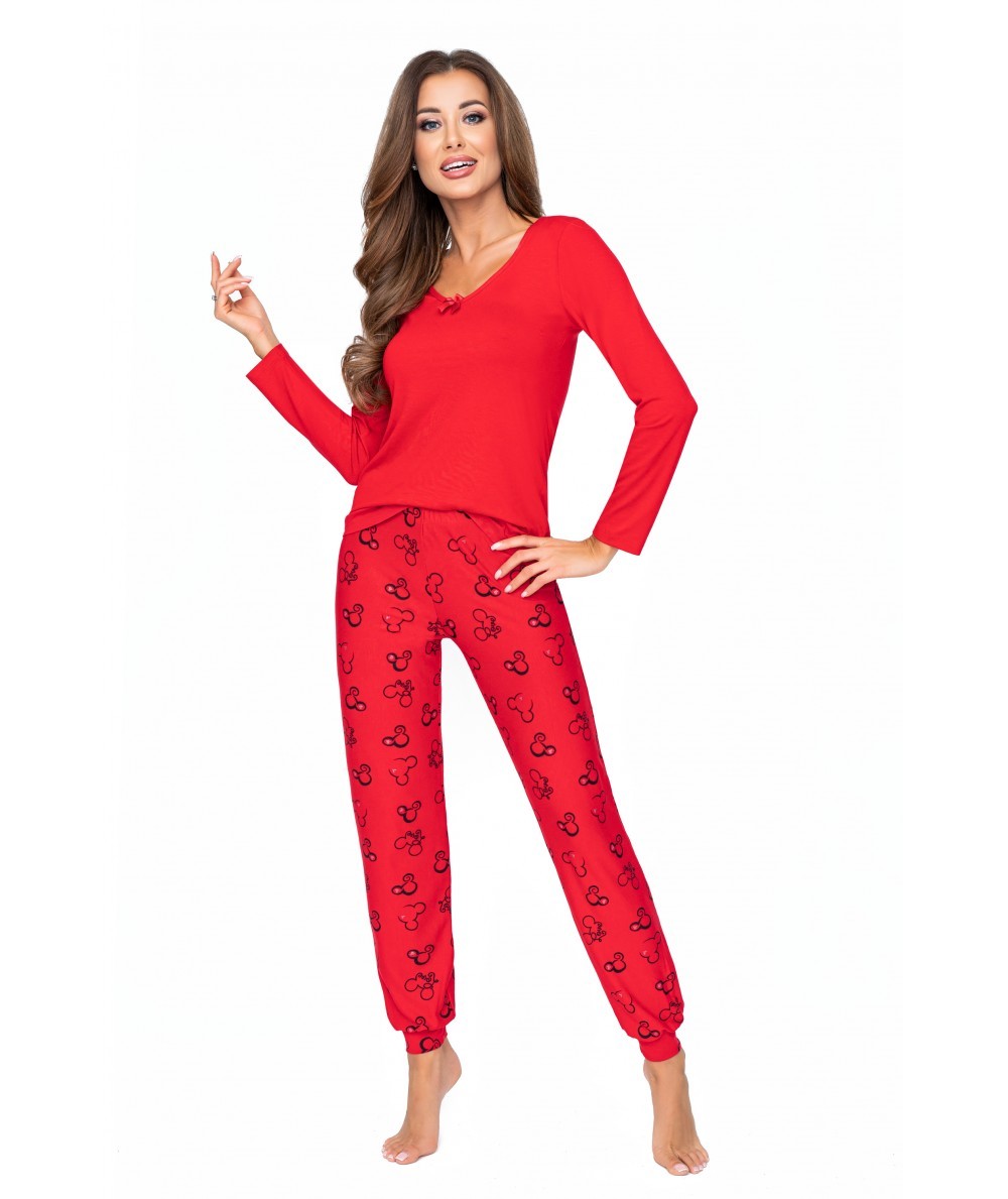 Piżama damska MIKA to komplet pełen luzu i radości. Bluzka z długim rękawem, z gładkiej, przyjemnie otulającej ciało wiskozy. Dekolt półokrągły, płytki, wykończony paskiem tasiemki, z filuterną kokardką pośrodku. Spodnie długości do kostek, o wąskim fasonie, zakończone ściągaczem. Zdobiący je motyw graficzny przywołuje pewną słynną, animowaną myszkę…