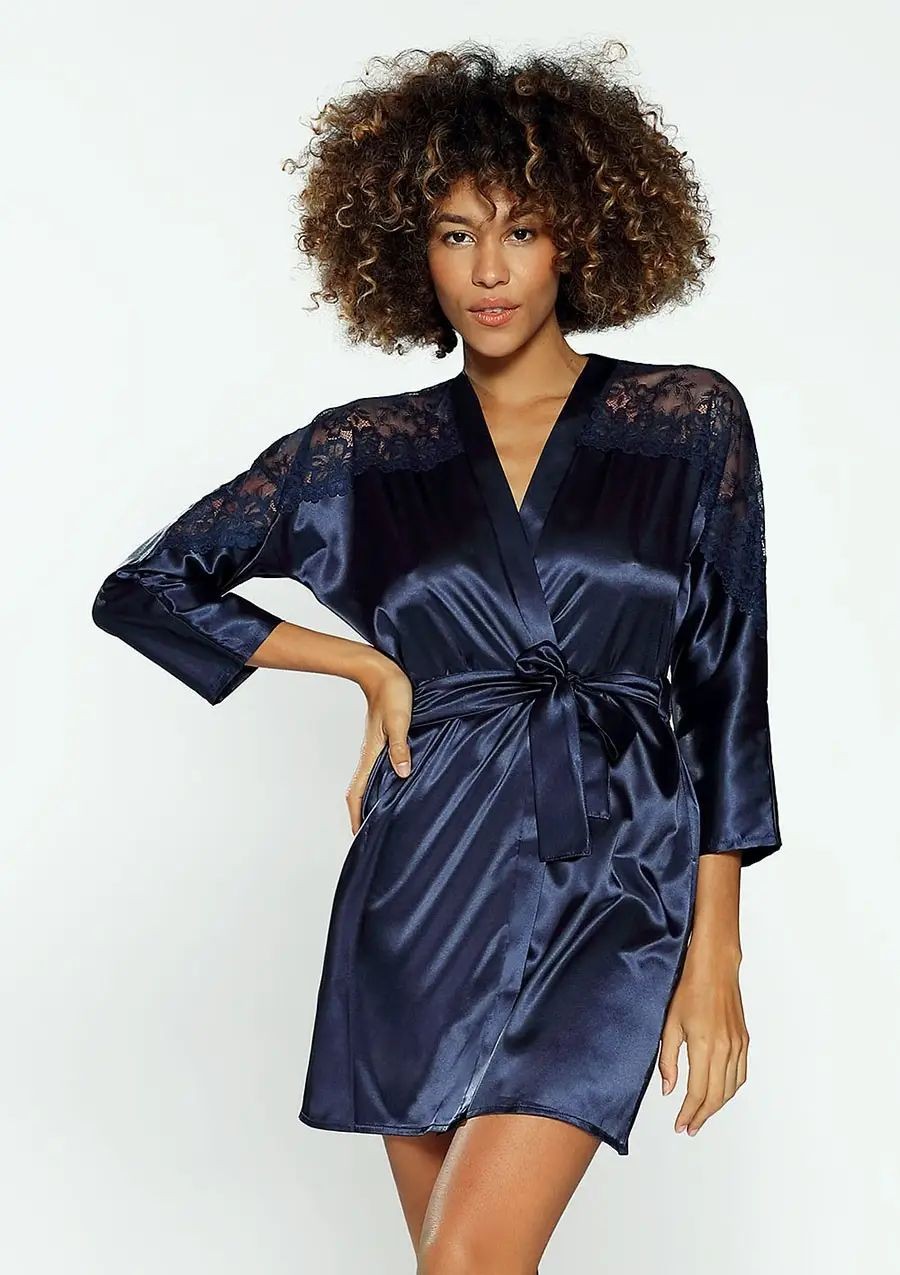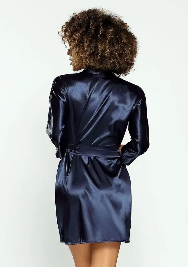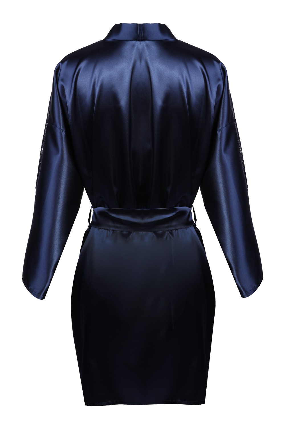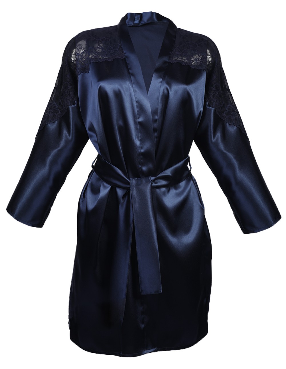 Krój szlafroczka jest prosty, ale koronkowa aplikacja na ramionach, sprawia, że całość tworzy subtelne, ale jakże seksowne wrażenie. Szeroki satynowy pasek pozwoli na zaznaczenie linii bioder oraz regulowanie głębokości dekoltu.
