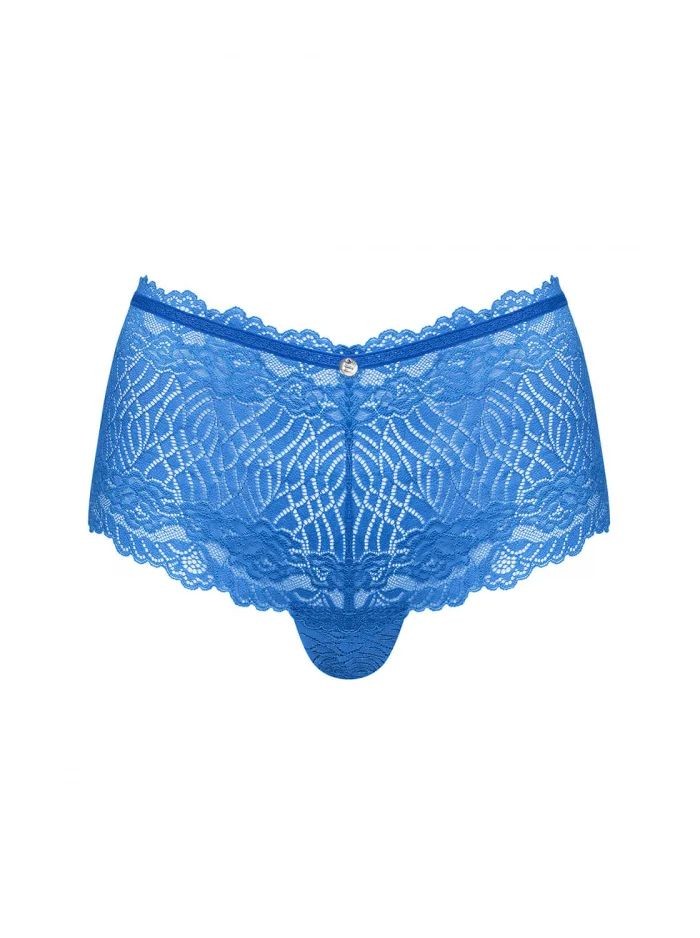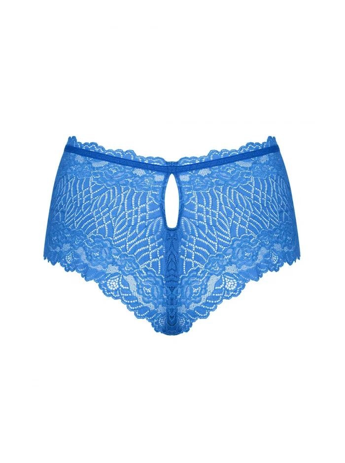 Seksowne, niebieskie szorty. Zjawiskowe połączenie pięknego koloru, prześwitującego wzoru i koronki. Eksponują pośladki niczym stringi. Ozdobne wycięcie z tyłu i biżuteryjna zawieszka z przodu. Przyjemny i elastyczny materiał dopasowujący się do ciała.